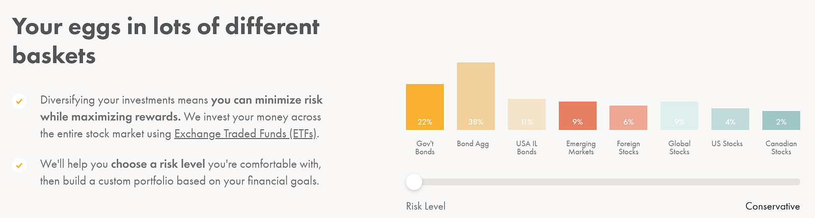 Wealthsimple allows 10 point risk level adjustment for people from any walk of life. No matter if they are from just starting their investing journey at age 19 or age 52. Wealthsimple caters to everyone with adjustable risk levels.