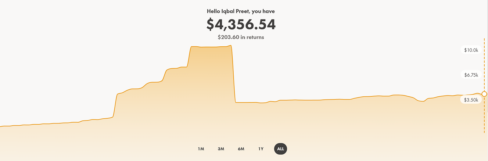 There is a graph showing the collective value of the accounts available in Wealthsimple. With the options of 1M, 3M, 6M, 12M, and All, it shows me how my investment is performing in those periods.